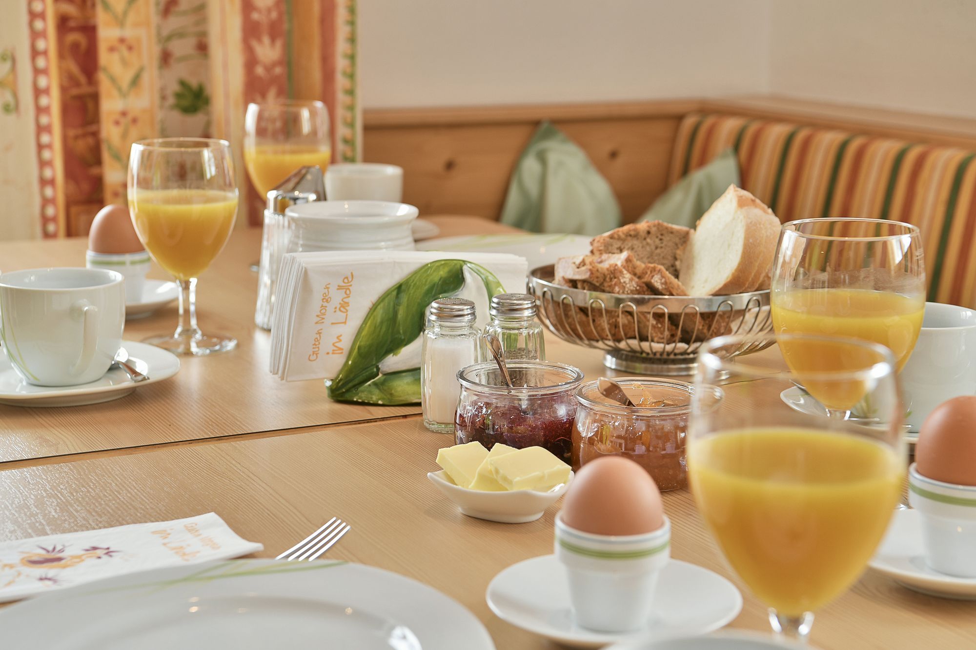 Ein guter Tag beginnt mit einem zünftigen Frühstück. Wir bereiten unseren Gästen ein reichhaltiges und abwechslungsreiches Frühstücksbuffet zu: